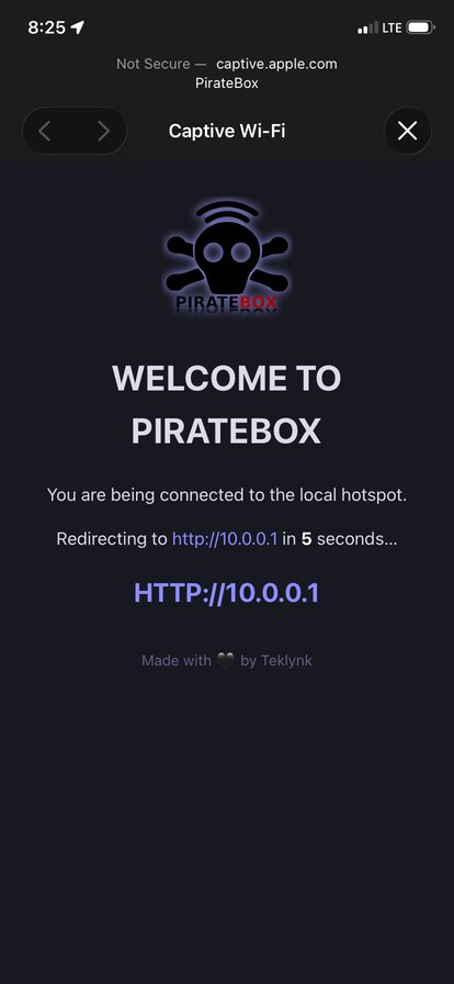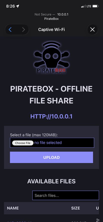 I loved the concept: a low-powered, discreet device that sparks people's curiosity when they see an open Wi-Fi access point named "PirateBox" show up on their phone. You connect to it and are immediately redirected to a page of files. Files that other curious people have uploaded. What's in them? Free movies or TV episodes? Selfies of the uploader? A note to whoever finds this?
