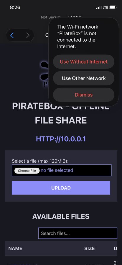 While you can navigate the PirateBox UI directly inside the captive portal, closing that window usually disconnects you from the Wi-Fi. To persist the connection, you'll need to tell your phone to stay connected despite the lack of internet access, often by tapping `Use without internet` in the top corner. Once settled, you can open your preferred browser and visit http://10.0.0.1. By design, all DNS requests resolve to this address. Remember, this is an *offline* file share, so there is no bridge to the outside internet. To leave, simply disconnect or switch networks.